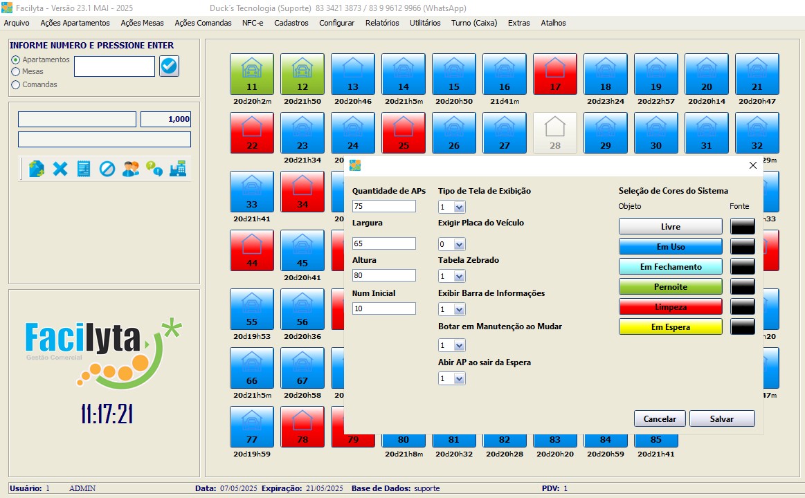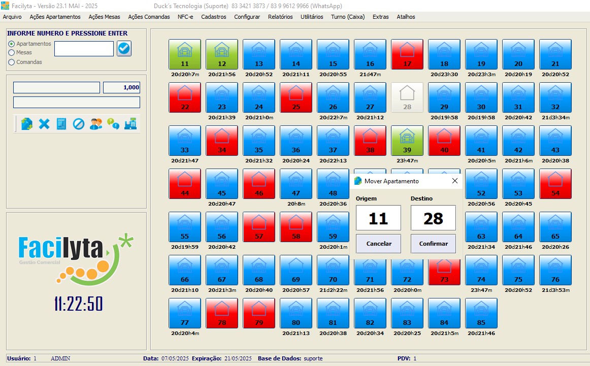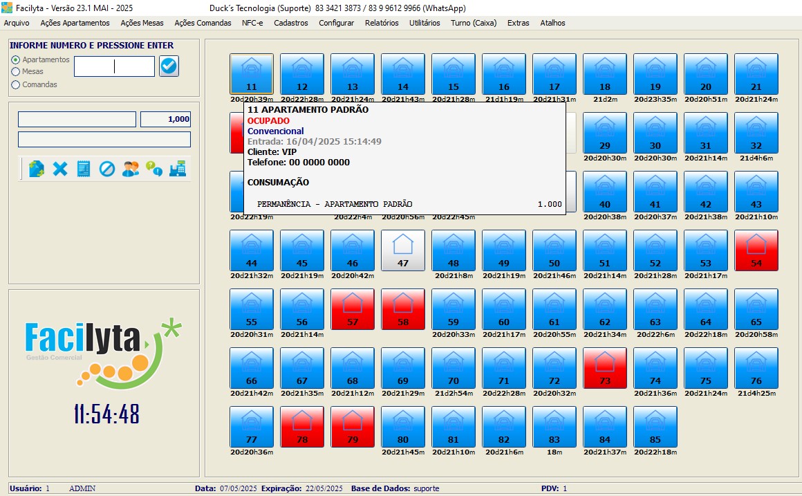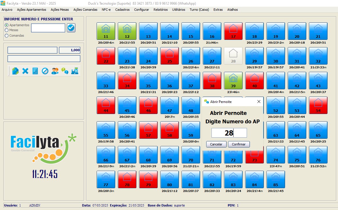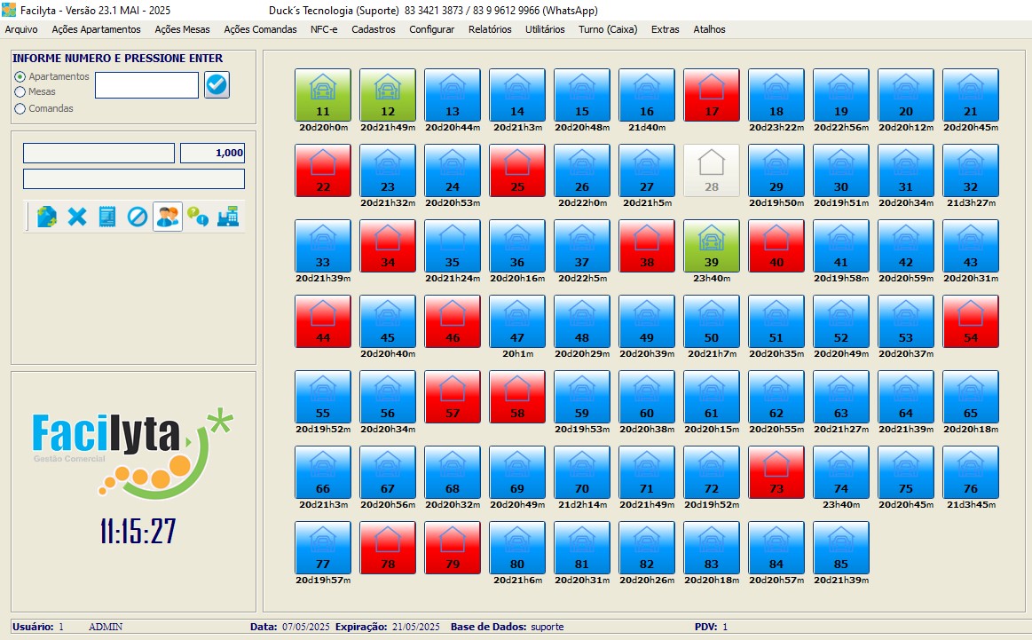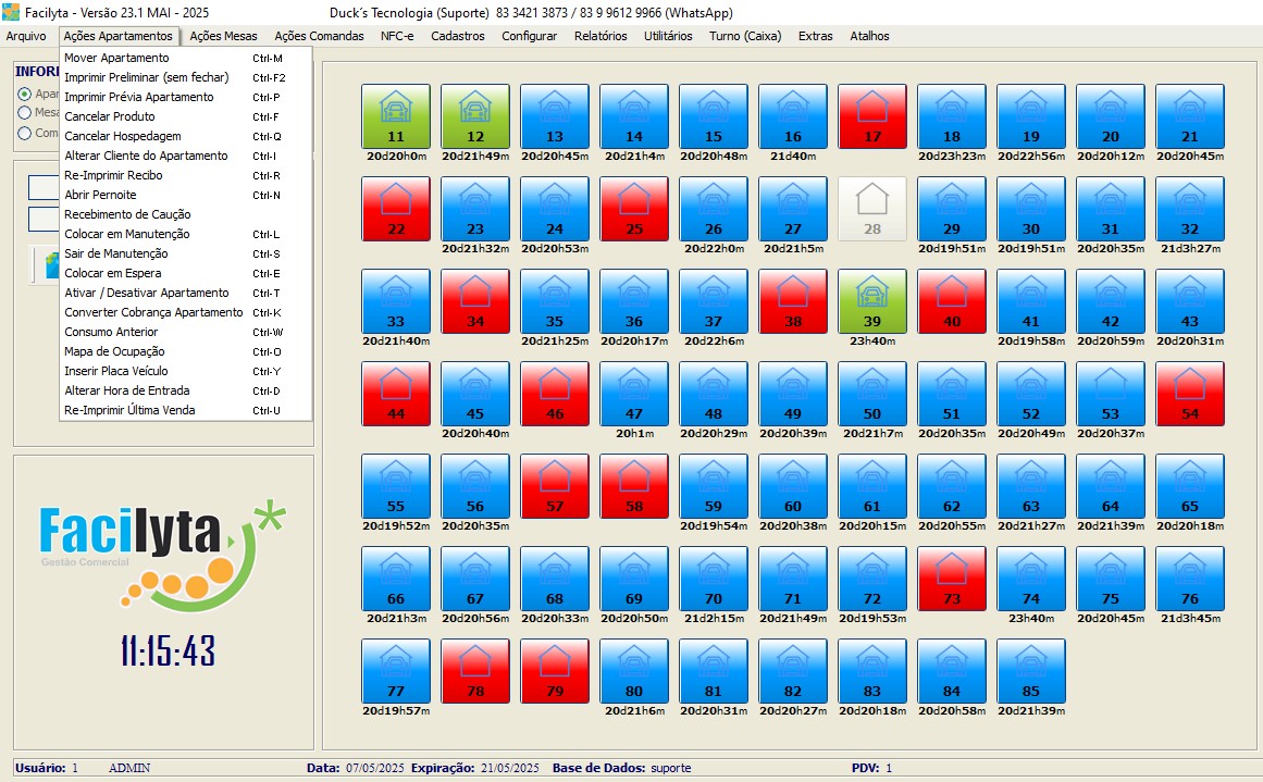 Na tela principal, você tem total visão e controle sobre os apartamentos, onde todas as funções podem ser executadas através de cliques simples e intuitivos. Onde você pode definir cores especificas para cada situação do apartamento